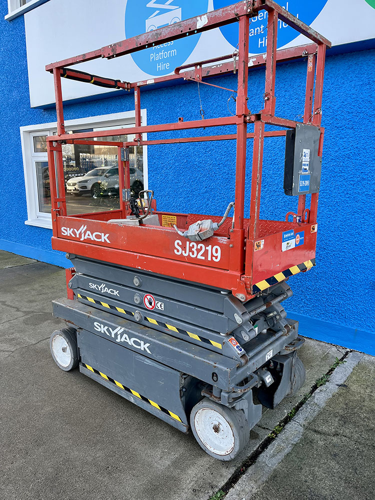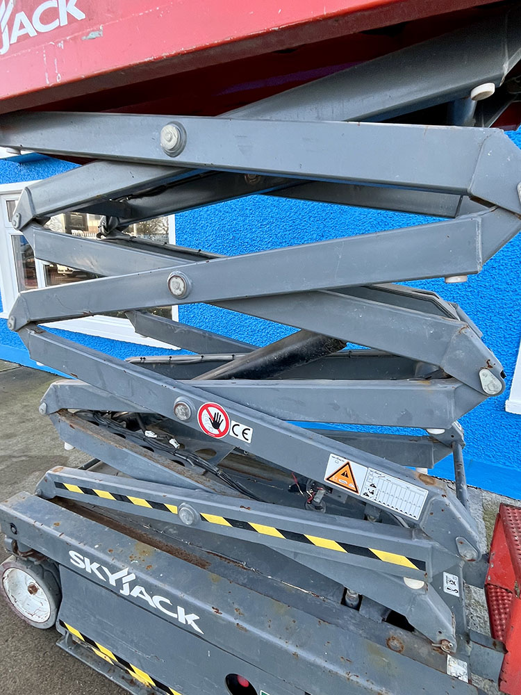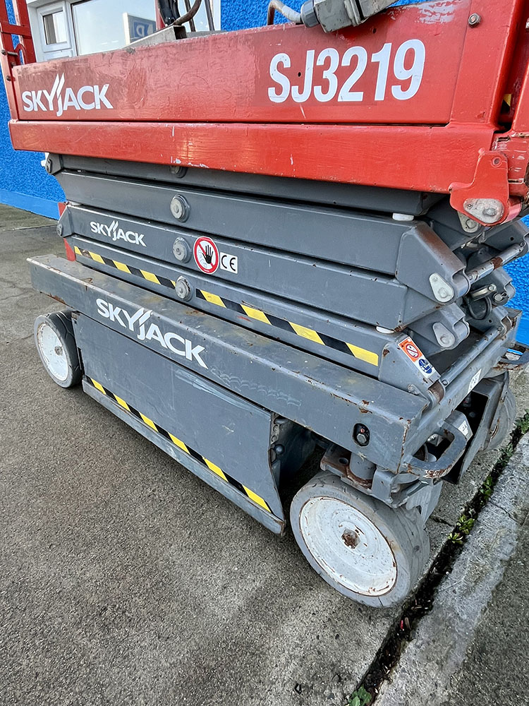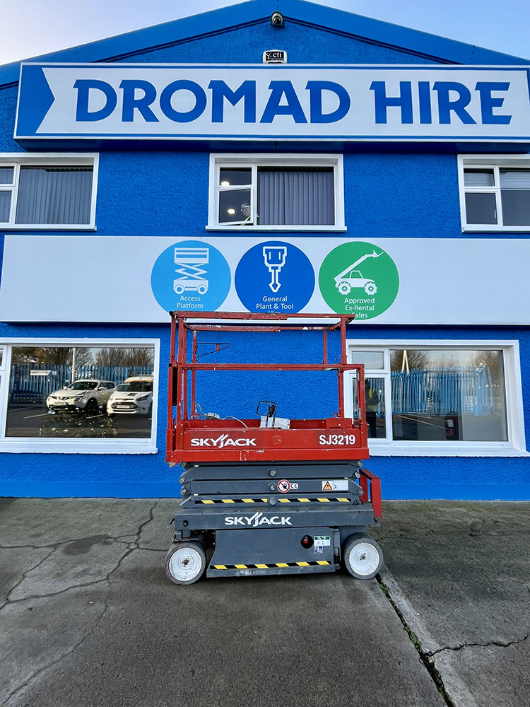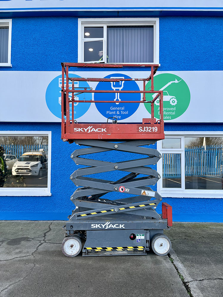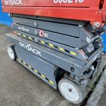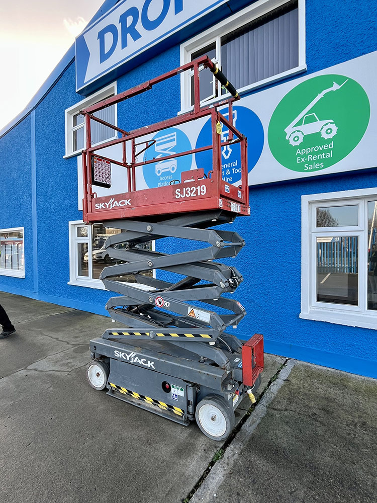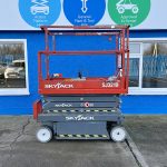 Skyjack SJ3219 Electric Scissor Lift, owned by Dromad Hire from new. This Approved Ex-Rental model is in meticulous condition – very low hire usage on this unit. Fully serviced & tested 23/10/2025 by our highly qualified engineer which included: new safety decals & site beacon.