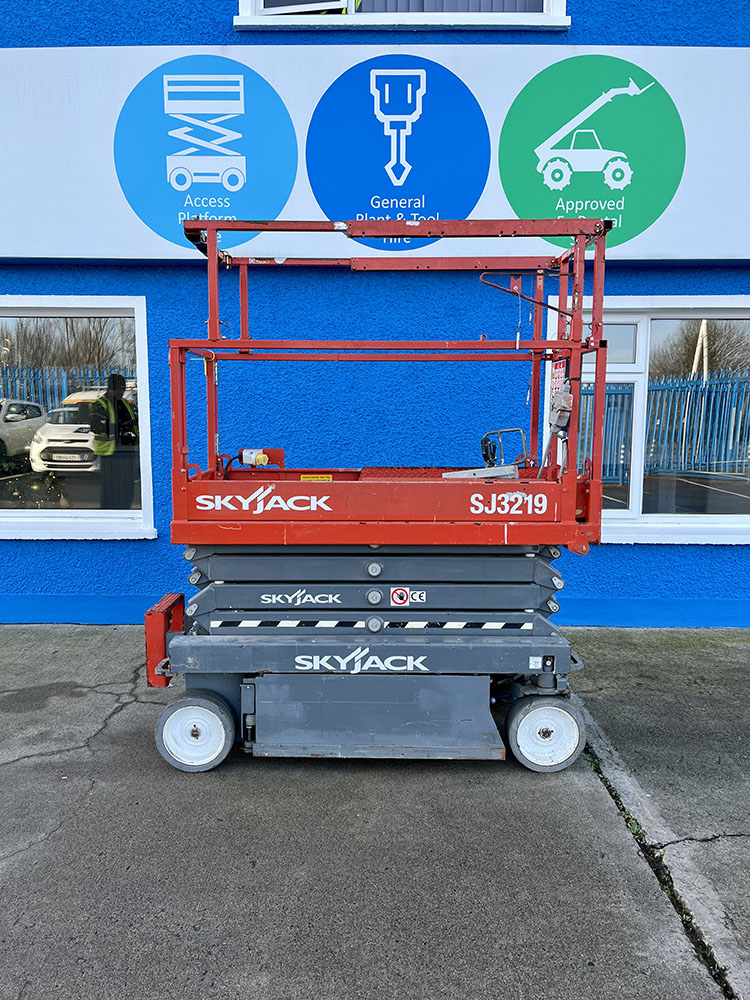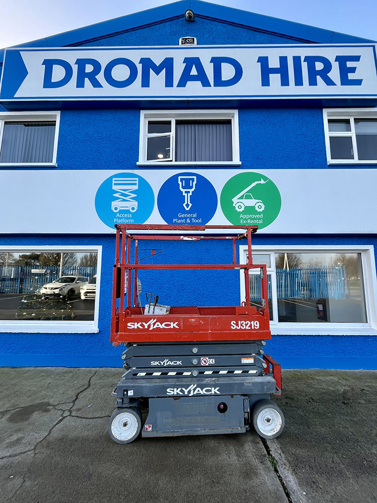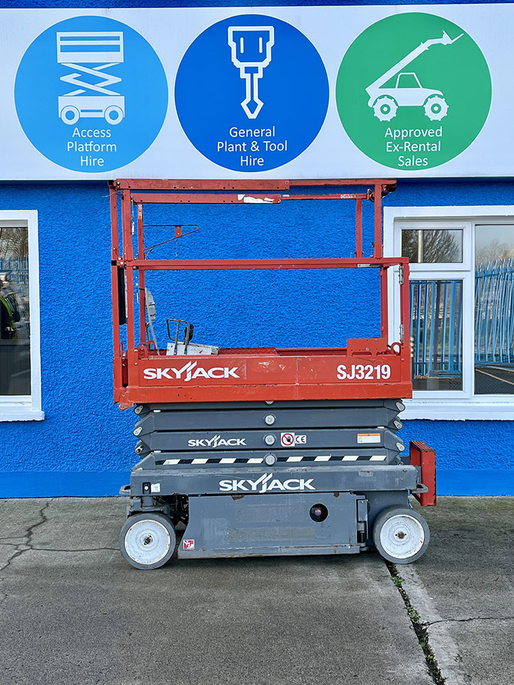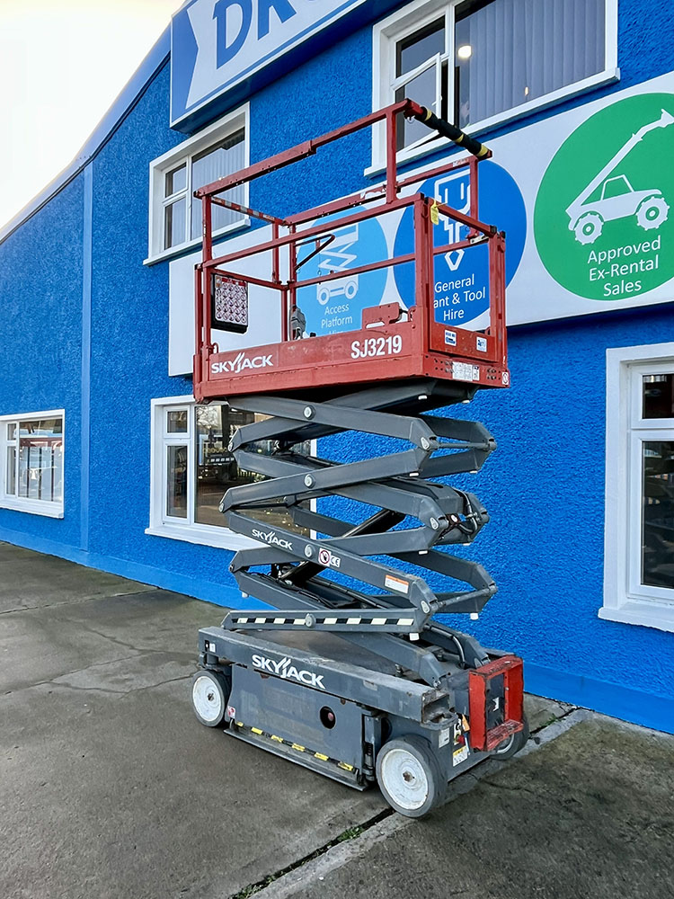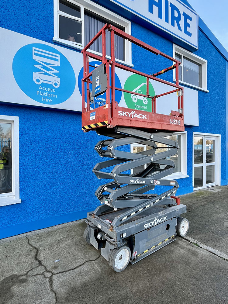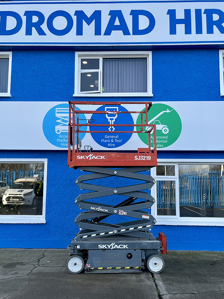 Skyjack SJ3219 Electric Scissor Lift, owned by Dromad Hire from new. This Approved Ex-Rental unit is in meticulous condition – with low hire hours and full workshop inspection completed. Fully serviced & tested 23/10/2025 by our highly qualified engineer which included: new safety decals & platform gate latch.
