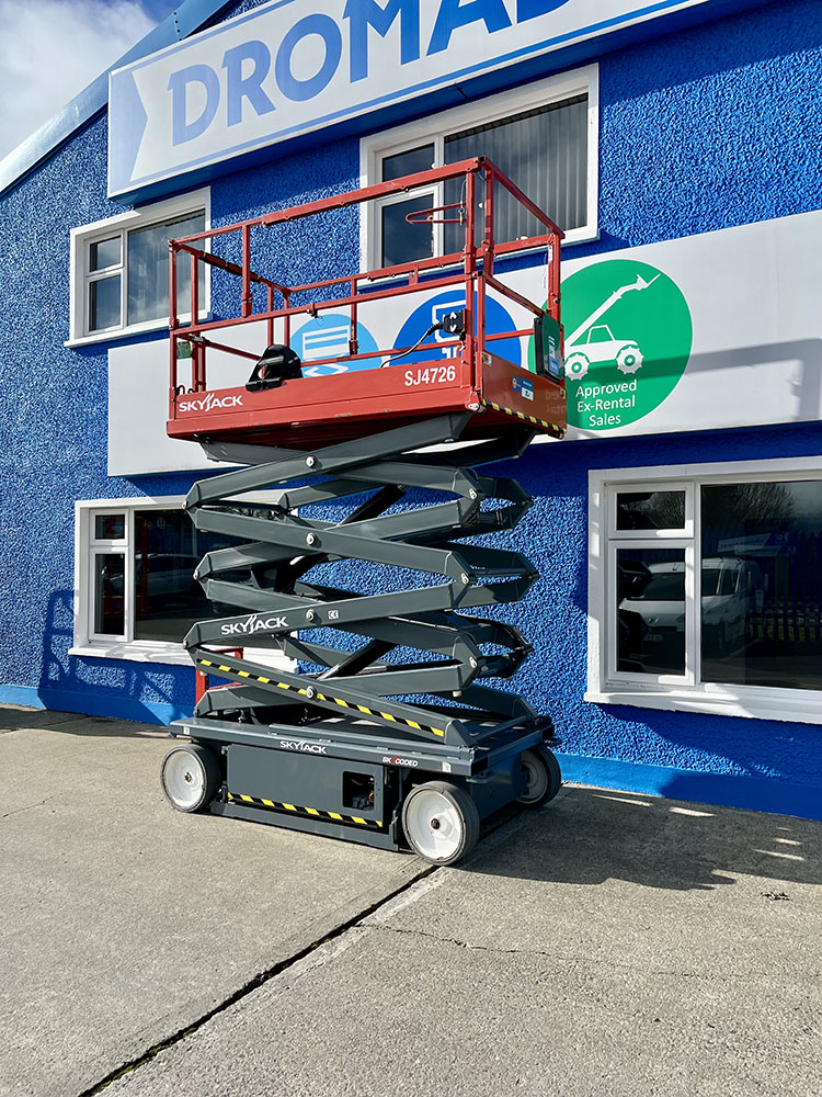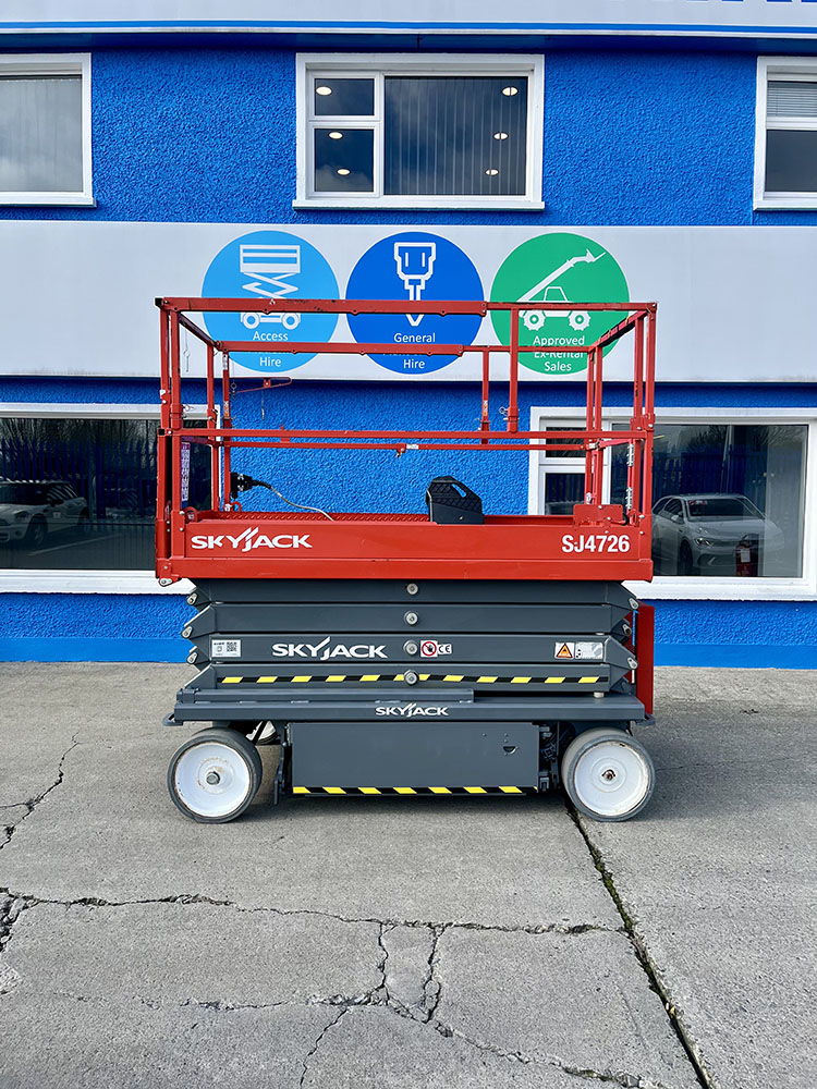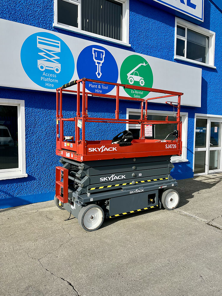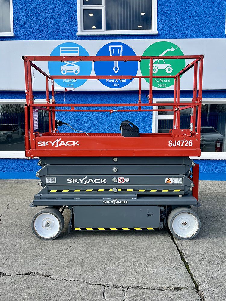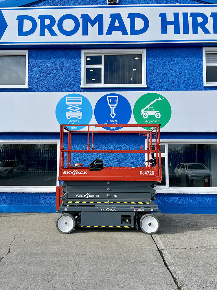 Skyjack SJ4726 Electric Scissor Lift, owned by Dromad Hire from new. This Approved Ex-Rental model is in meticulous condition with very low hire usage. Fully serviced & tested 09/01/2026 by our highly qualified engineer, which included: new platform control decals & platform gate latch.