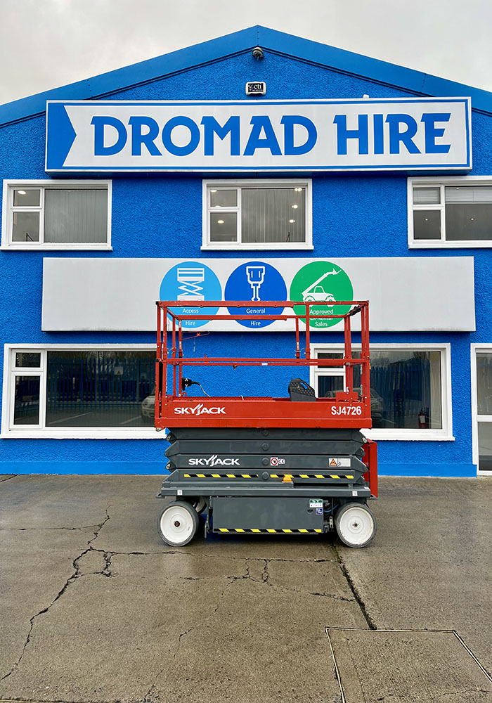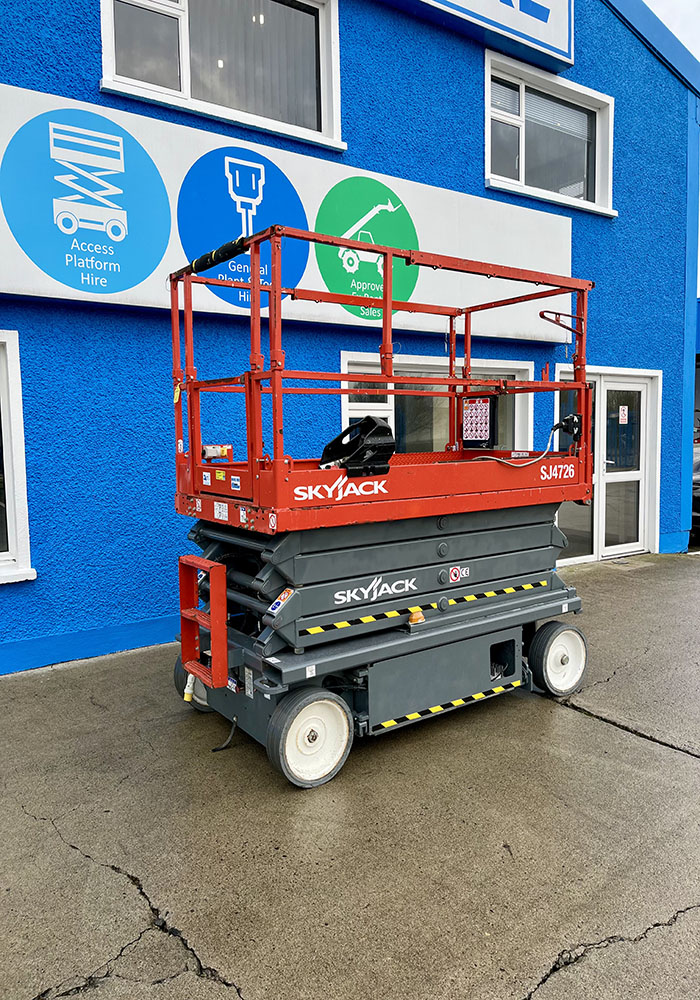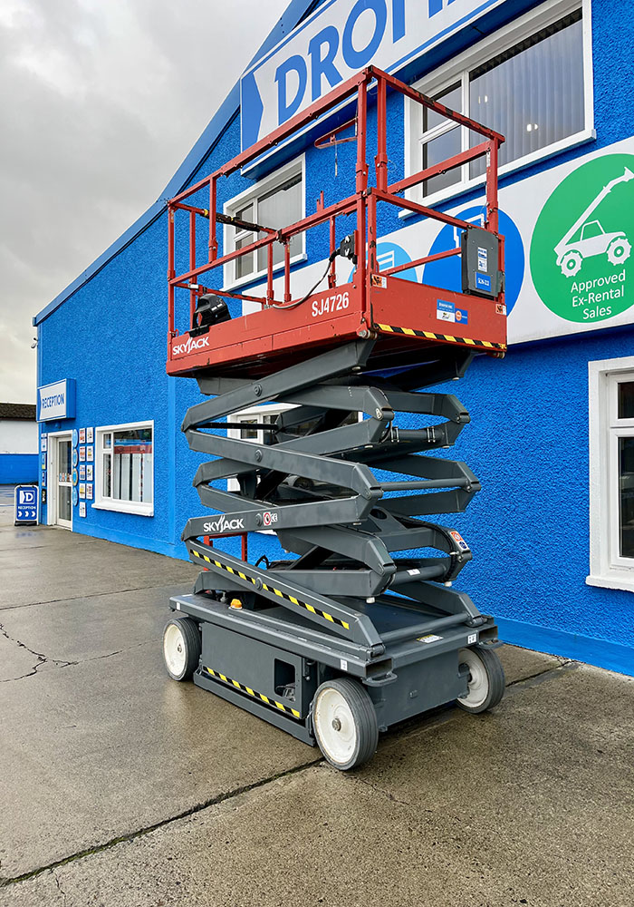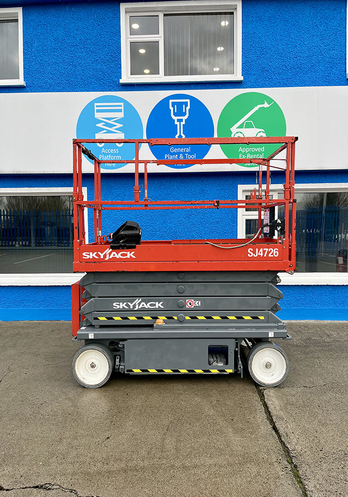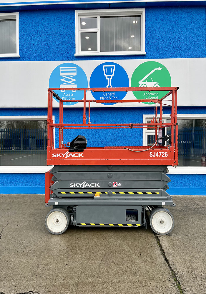 Skyjack SJ4726 Electric Scissor Lift, owned by Dromad Hire from new. This Approved Ex-Rental model is in pristine condition – viewing highly recommended. Fully serviced & tested 09/01/2026 by our highly qualified engineer, which included: new safety decals & new operator manual box.