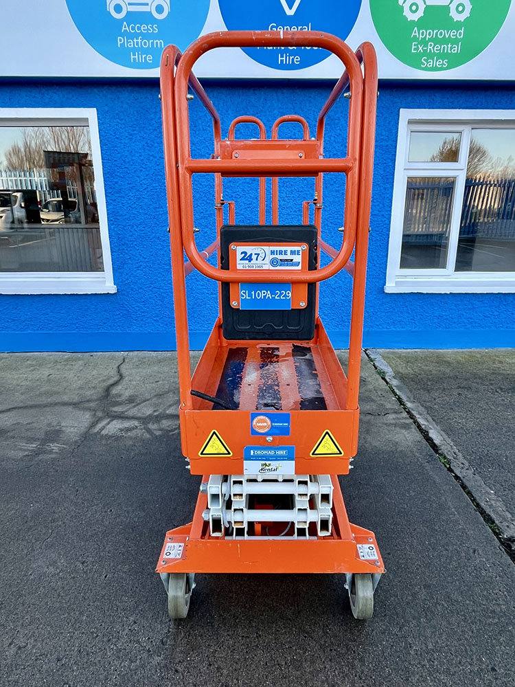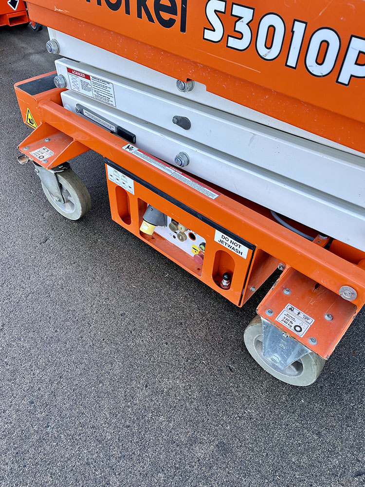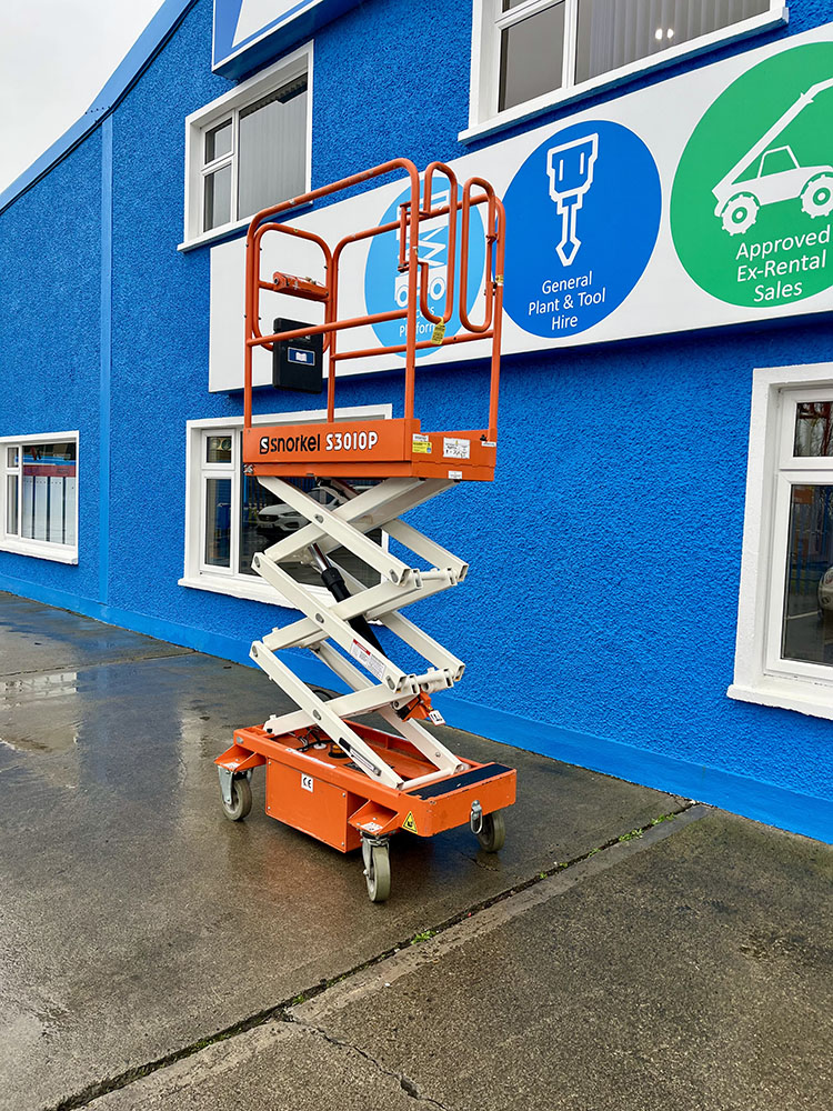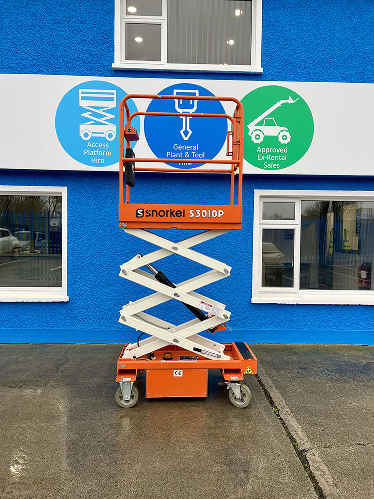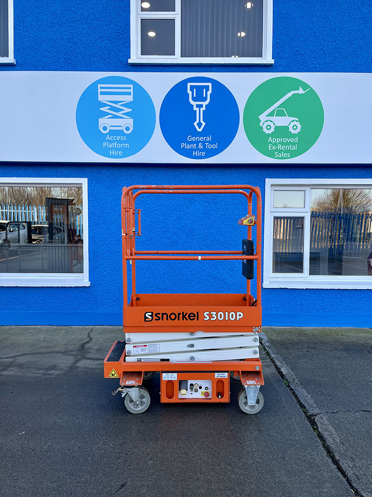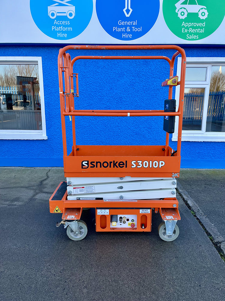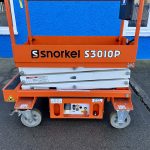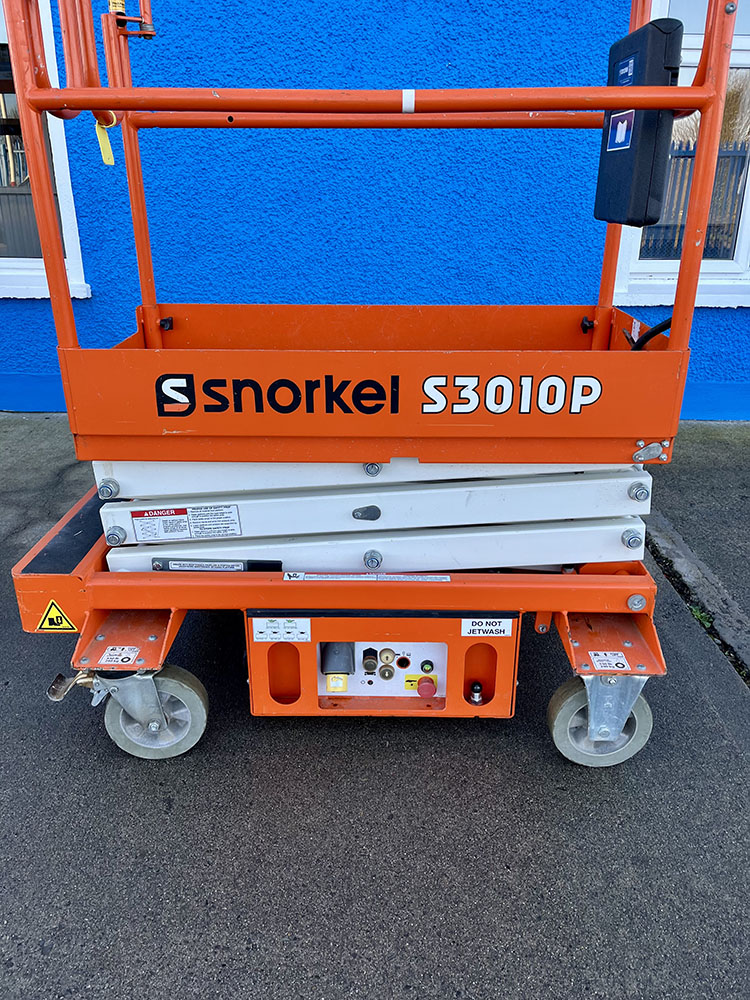 Snorkel S3010P Push-Around Scissor Lift, owned by Dromad Hire from new.This Approved Ex-Rental unit is in pristine condition – viewing highly recommended. Fully serviced & tested 23/10/2025 by our highly qualified engineer which included: new locking pins & operator decals.
